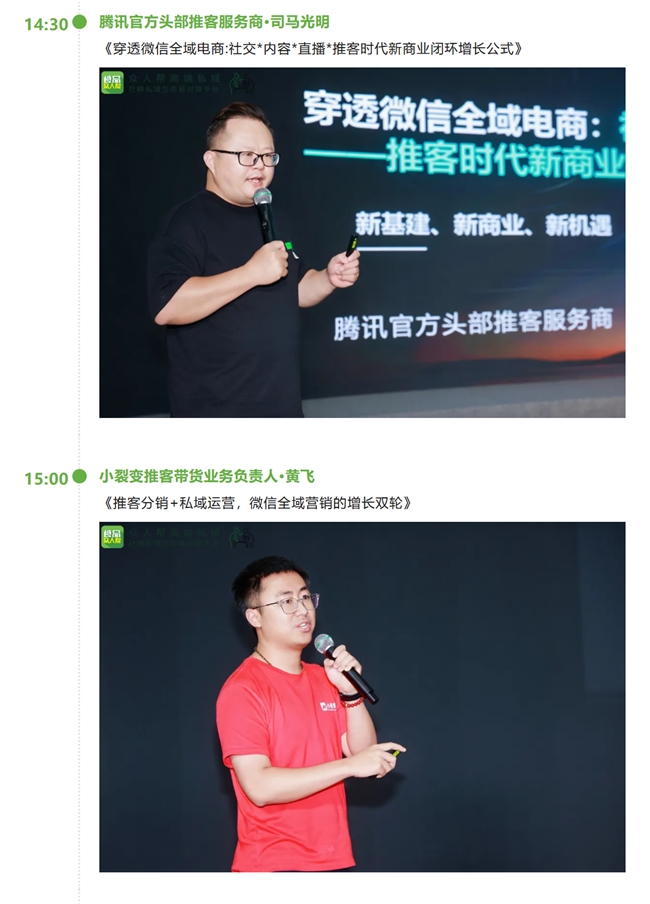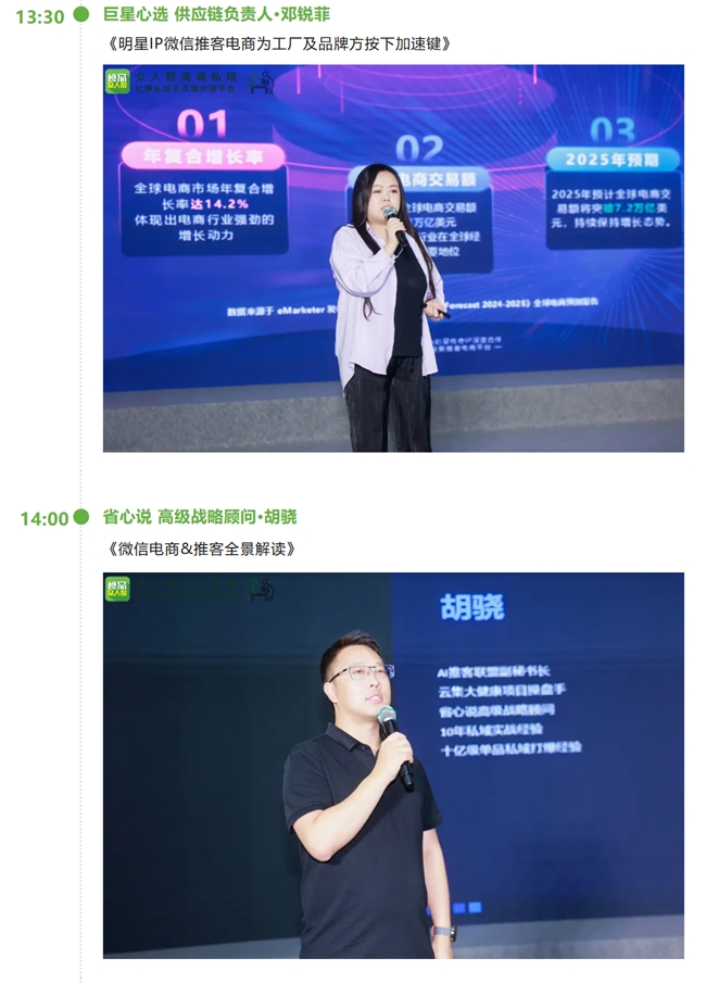 嘉宾们围绕明星IP赋能推客电商、微信全域电商闭环构建、推客分销与私域运营结合、私域直播实战技巧等议题展开分享,深度挖掘微信生态的私域潜力,助力品牌打通“流量-转化-复购”的全流程,为微信生态内的私域运营提供创新思路与实践方案。