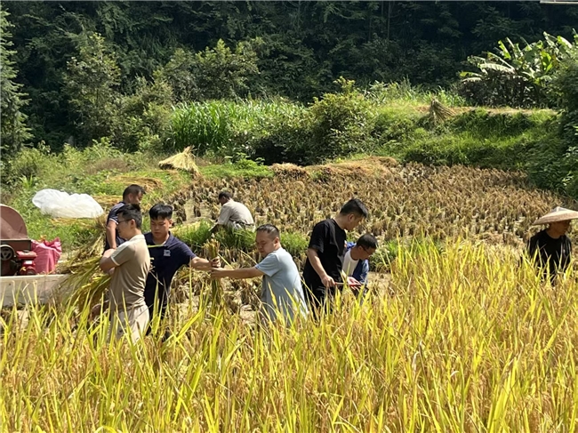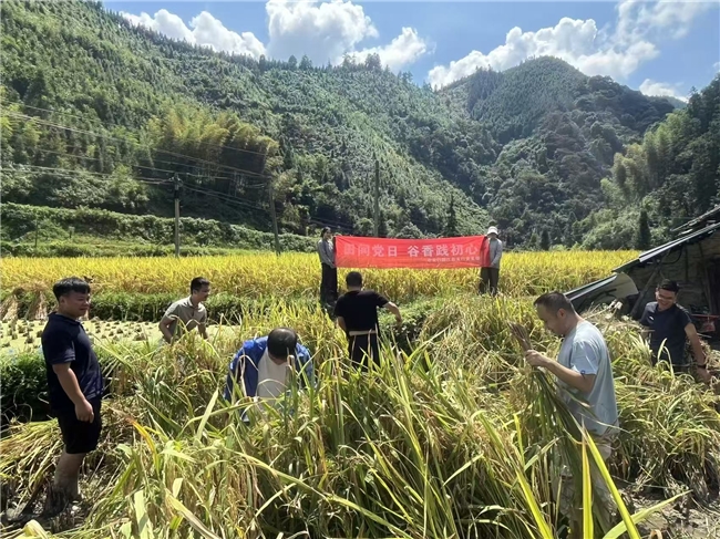 长寿村里,金黄的稻浪与翠绿的山林相映成趣。支行党支部的党员们挽起裤脚、踏入田间,与农户一同投身秋收工作。大家分工协作,有的手持镰刀收割稻穗,有的操作农机分离稻谷,有的搬运整理稻捆,田间地头处处是忙碌的身影。尽管汗水浸湿衣背,泥土沾满裤脚,但党员们的干劲十足,以实际行动诠释着为农服务的职责。