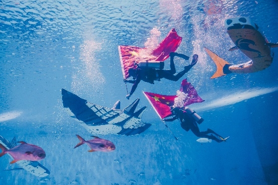 同时,上海海昌海洋公园还将推出多场新文化主题演出,实现传统与海洋的创意融合。10月1日至3日,2025年中国美人鱼公开赛暨国际精英赛冠军以三星堆出土文物为灵感,领衔演绎“青铜人面水舞秀”,化身象征祥瑞的神鸟,在碧波间舞动,仿佛唤醒沉睡千年的古蜀图腾。10月4日至6日,于海底世界馆内精心打造出巨型“圆月”景观,美人鱼化身“嫦娥仙子”,海底长袖舞动,轻盈“奔月”,与鱼群穿梭互动,将神话与水下美学完美融合,为游客呈现如梦似幻的沉浸式体验。