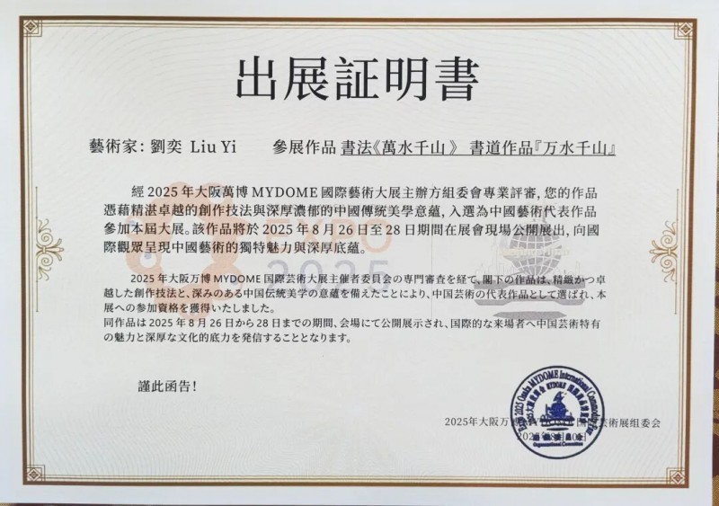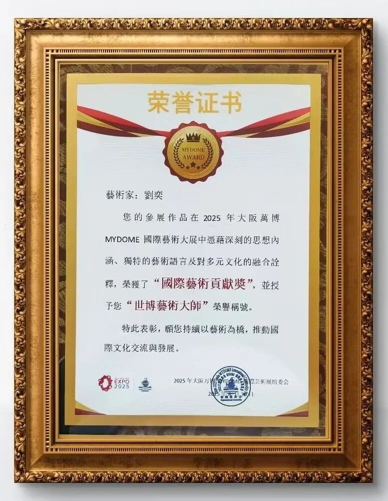 刘奕书法作品应邀参加2025大阪世博会国际艺术展,获组委会颁发的“国际艺术贡献奖”;本人被授予“世博艺术大师”称号。