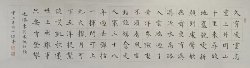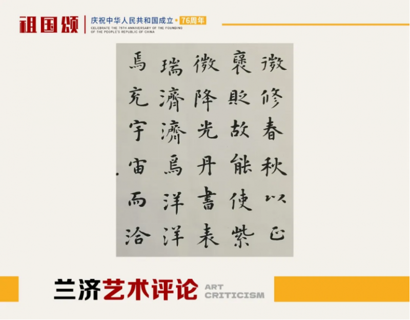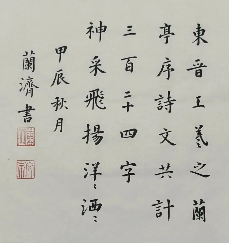 兰济之书,以其楷书为最佳,其从唐楷入门,上溯钟、王遗迹及北魏诸墓志,尤奉《十三行》、《孔子庙堂碑》、《圣教序》为圭臬。总体路子是回归传统,回归经典,以古为师,宗古而弃俗也。明眼人一看就知道,其走的路是对的,也是正确的,只有路子走对了,才可能走得更远,才可能避俗近雅、步入庙堂。兰济近年斩获颇多,作品入展“尧山杯”全国书法兰亭新人奖、“邓石如奖”全国书法展、全国第十届书法篆刻展,荣获全军第二届军营廉政文化优秀书画展一等奖、全军第五届书法展三等奖等,如此成果,应该是对他多年来的付出给予的肯定吧。