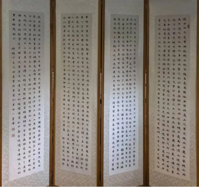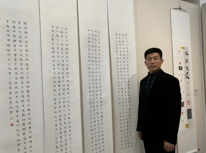 从军二十多年的兰济,出生于“文成武就”的山东成武,此地乃西周之郜国故都,秦时置县,素有“万亩城湖”之称的文亭湖孕育了这一方水土,也养育了这一方人。素有伯乐之称的孙阳、晏子等先贤均生于此,可谓人杰地灵,底蕴深厚。也许受文亭湖的滋养,和当地黑陶、瓷刻、发绣等文化艺术的熏陶,使兰济自幼对中国的传统文化有着浓厚的兴趣,喜临池、好弄墨,二十余年钟情艺事,心追手摹,乐此不疲。在我看来,二十年来能够坚持一件事情,并不是一件简单的事,可见其痴,其韧劲,其对书法之爱。反观之,其把心性付诸于书法,书法亦滋养了他的沉静之气,以达中和之美,可谓相得益彰。