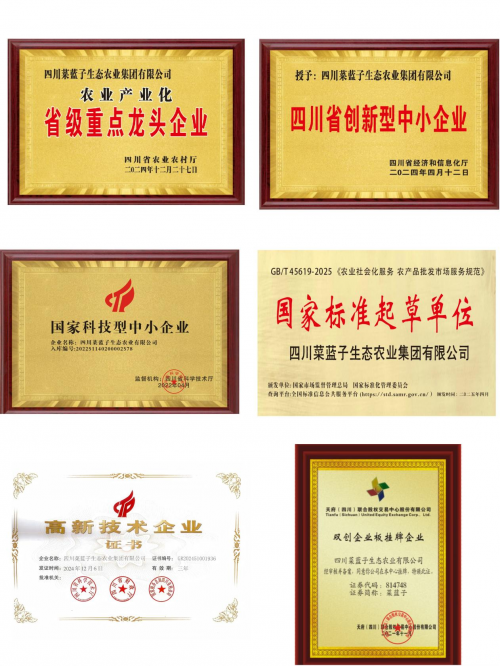 公司的发展成果显著,已通过质量管理体系认证、食品安全管理体系认证等十项权威认证,荣获“国家科技型中小企业”“高新技术企业”“省级重点龙头企业”“四川省创新型中小企业”“四川省定制化生产重点企业”等众多荣誉,并参与起草国家标准《农业社会化服务 农产品批发市场服务规范》及《食品配送供应链质量管理规范》等多项团体标准。