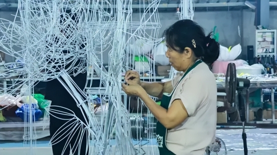 (电焊造型)利用钢钳、焊机等工具,将捡样后的金属架制作成立体造型。