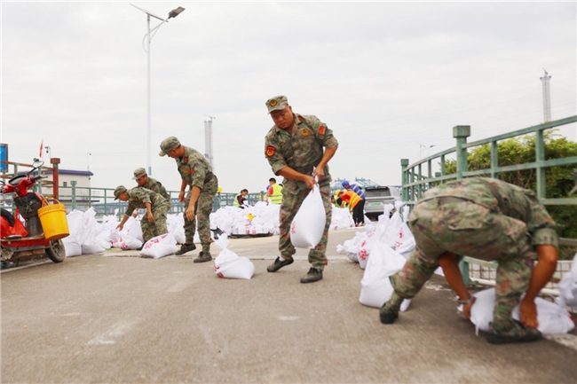 抢时间,加固防洪堤坝。裕安村、沙仔村的堤坝是民众街道的重点风险点,为了防止出现渗水破堤的情况出现,武装部迅速组织民兵应急队伍30人,在水务事务中心指导下对沙仔涌水闸堤段、裕安堤段进行防风处置,大家分工协作,铲沙、装袋、搬运、堆砌一气呵成,堆放沙包2千多个,加高堤防长度合计600多米,为沿岸居民区筑起一道坚实的“防洪墙”。
