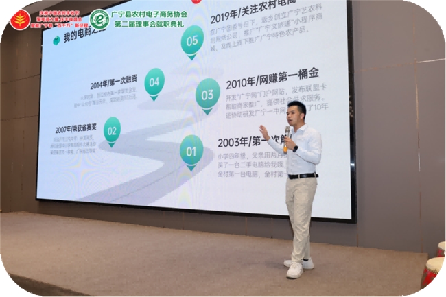 在会长致欢迎辞环节,新当选会长关汉槐以一场别开生面的脱稿演讲引发全场共鸣。他从“20年前触网的电商之缘”切入,分享了历年创业心路历程,将个人成长与广宁电商产业发展脉络紧密结合。