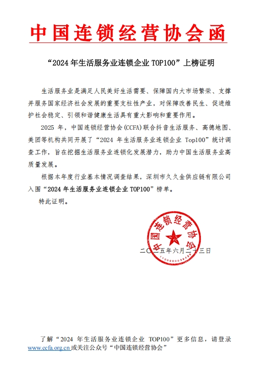 2025 年,中国连锁经营协会(CCFA)联合抖音生活服务、高德地图、美团等权威机构公布 “2024 年生活服务业连锁企业 Top100” 榜单,久久金管家凭借科技赋能本地生活服务的创新实践,作为黄金回收领域标杆企业,成功入选为该榜单中二手回收领域的代表性品牌。
