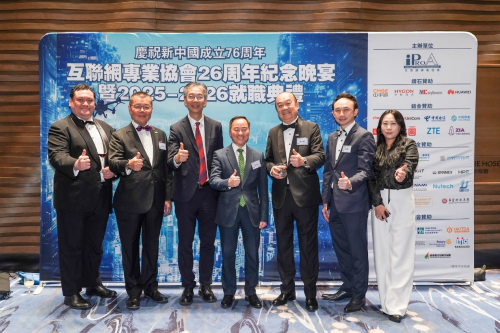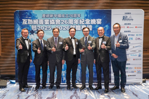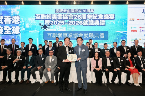 互联网专业协会于9月22日举行「庆祝新中国成立76周年、互联网专业协会26周年纪念晚宴暨2025 - 2026就职典礼」。创新科技及工业局局长孙东教授,JP莅临担任主礼嘉宾,与各位嘉宾、互联网专业协会荣誉会长、常务理事会成员及会员、同业超过500人,一同庆祝国庆76周年及协会成立26周年,祝贺国家繁荣昌盛,协会迈向新的高度。