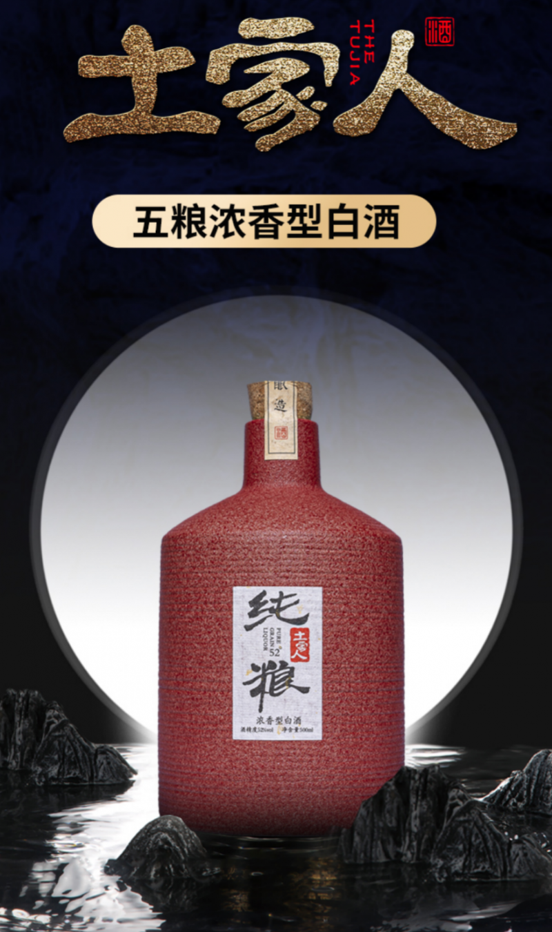土家人酒的独特风味源于精选的五种粮食原料,玉米、高粱、小麦、糯米和大米。这些原料依循土家人传统酿酒秘方,结合现代高新工艺精心酿造而成。酿酒所用的水源来自湘西优质梅花泉水,为酒品增添了独特甘甜。土家人酒的酿造工艺尤为独特,采用“三高两低”工艺:高温制曲、高温堆积、高温入池、高温发酵、高温润料、高温接酒,以及低糖化曲、低出酒率。同一批原料要经过九次蒸煮、八次加曲堆积发酵到七次取酒,历时一年,且每次入窖前要喷洒一次“尾酒”,形成了独特而科学的酿酒技艺。基酒需窖藏三年以上,成品酒更要放五年以上方可出厂,让酒液在时光中沉淀出“入口协调丰满、回味幽雅绵长”,每一滴都饱含山野灵气与匠人深情。
