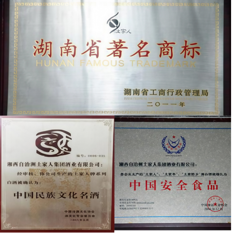 土家人酒业凭借卓越品质赢得了广泛认可。2006年,“土家人”系列白酒被认定为“中国民族文化名酒”“中国安全食品”;多次斩获“湖南名牌产品”称号,2011年被湖南省工商管理局评为“湖南省著名商标”。在企业信誉方面,连续多年被评为“重合同守信用企业”,2003年被省人民政府授予“重质量守信誉百佳企业”;2006年,成功跻身于湖南省私营企业100强,并通过ISO9001国际质量管理体系认证,彰显严谨品控态度。2022年,经湖南省商务厅认定,正式获评“湖南省老字号”称号,为品牌百年酿艺正名。