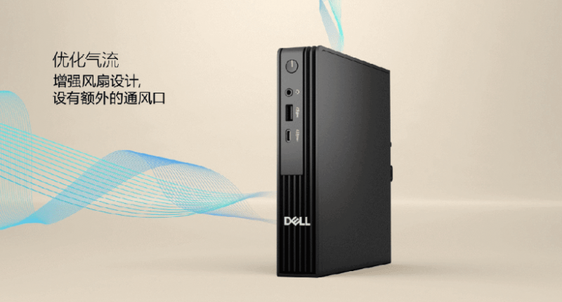 就如这台Dell Pro Micro台式机,其顶部与侧面的线性通风口采用仿生学格栅设计,进风量明显优于传统微型台式机,形成前吸后排+上导的立体气流循环,确保CPU、显卡、硬盘等核心部件均处于有效散热区域。