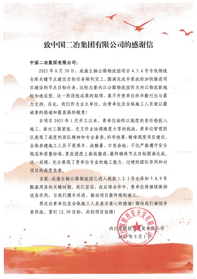 近日,中国二冶收到内江蓉欧投资开发有限公司感谢信,对中国二冶在成渝主轴公路物流园项目中,能够以高度的责任感投入项目建设,圆满完成关键节点目标任务致以最诚挚的感谢和崇高的敬意。