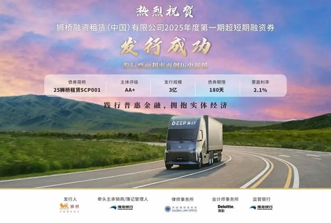 作为在物流运输平台、卡车金融及交易服务领域具有市场领先地位的企业,狮桥集团本次债券的成功发行,进一步优化了集团的债务结构,显著降低了融资成本,体现了资本市场对狮桥集团长期稳健经营成果的高度认可。同时,这也彰显了资本市场对狮桥集团未来在商用车金融领域持续、稳定发展的信心与期待。