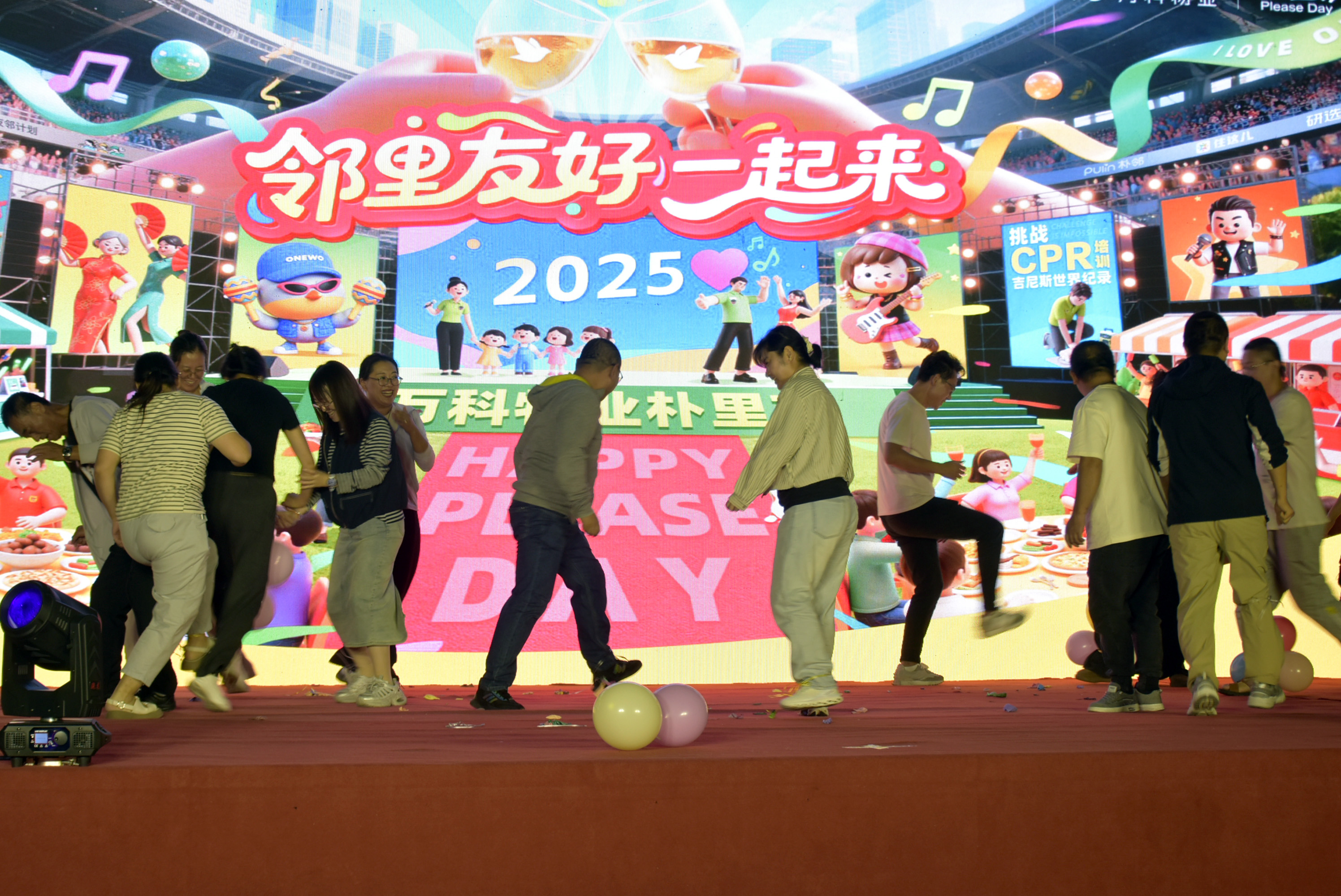 经典变脸表演变幻莫测,每一次脸谱切换都引来阵阵惊叹;悠扬的萨克斯、幽默的二人转、柔美的柔术等节目轮番登场,满足不同年龄层业主的观赏需求。当晚最具意义的环节,当属CPR创造吉尼斯纪录挑战。业主们积极参与实操,最终数千人同步完成规范CPR动作,成功助力创下新的吉尼斯纪录。“既能看晚会,又能学急救技能,还能参与破纪录,这可真是太有意义了!”参与挑战的业主兴奋地说道。