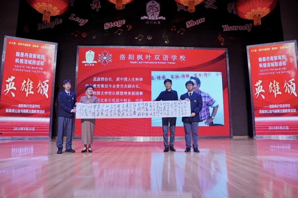 “以翰墨传情,用丹青铸魂”,活动现场最动人的环节,莫过于英雄颂文化工程组委会的书画作品捐赠仪式。组委会秘书长张晓辉代表组委会,向洛阳枫叶双语学校赠送两幅珍贵书法作品,每一幅都承载着对英烈的崇敬与对少年的期许。