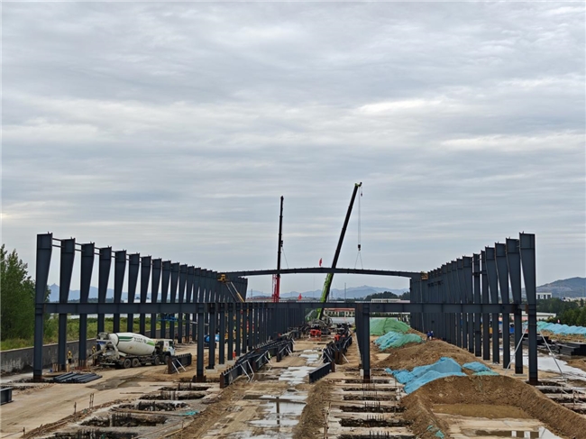 施工现场,双机抬吊精准地将屋面梁吊运至安装位置,工人们相互配合,进行钢构构件的安装与拼装作业。目前,钢结构主体已初具规模,一列列钢柱与横跨其上的钢梁,彰显出工程建设稳健而坚实的推进态势。