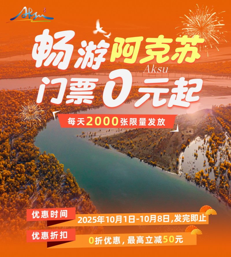 阿克苏于10月1日起在携程平台上线“0元游”景区消费券活动。每日投放2000张景区消费券,8天累计8000张,游客抢券后下单可享0折优惠,最高立减50元,天山托木尔峰、克孜利亚胜景、库车王府等热门景区均可免费畅游,真正实现"零门槛"领略阿克苏壮美风光。