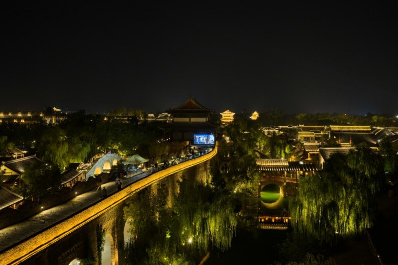 而西城墙则化身为数字艺术现场,“时空折叠”YANGII数字艺术作品展震撼呈现,打造出一个充满未来感的赛博宋词打卡空间。十二幅高达六米的巨制画面铺陈于城墙长廊,画中女子策马穿越青砖古道,藕瓣与数据流交织坠入圆月,李清照的身影悠然浮现于垂柳波光间。赛博蓝光与古城黛瓦交相辉映,形成一条条光影隧道与虚实交织的景观,随手一拍皆是融合科幻与国风的大片体验。