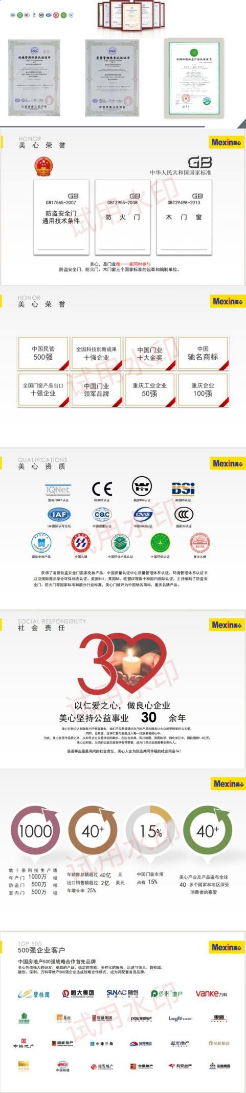 品牌优势:美心,是门业唯一一家同时参与防盗安全门,防火门,木门窗三个国家标准的起草和编制单位。