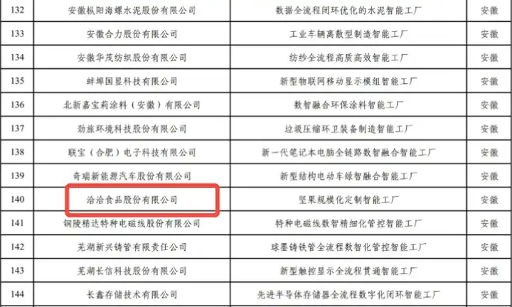 近日,工业和信息化部2025年度卓越级智能工厂项目结束公示,洽洽食品「坚果规模化定制智能工厂」成功入选,成为坚果行业唯一获此殊荣的企业,同时也是安徽省食品行业唯一入选单位。