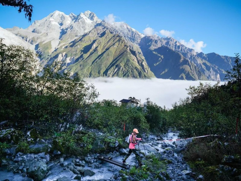 为了让选手在挑战中收获多元体验,赛道深度融合了海螺沟景区雪山、温泉、原始森林、乡村等资源——以成熟的景区森林步道为基底,巧妙串联起乡村旅游路与承载红色记忆的红军小道,让极限挑战的过程,也成为感受自然风光与人文故事的旅程。