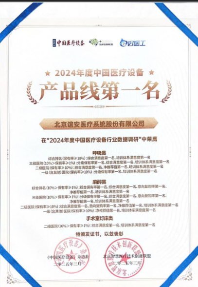 谊安客服团队凭借卓越表现,已连续多年荣获中国医疗设备“民族品牌金奖”“社会责任奖”,呼吸类、麻醉类产品线多次获得全国第一名,并收获多家医疗机构锦旗和感谢信,客户认可度高。
