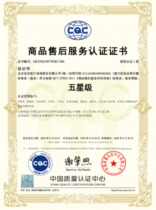 在当前医疗器械市场同质化产品层出不穷、技术竞争日益白热化的背景下,企业的售后服务已成为影响业绩、甚至决定生存的关键因素。此前,谊安已正式取得商品售后服务认证证书(五星级),这一权威认证不仅是对其服务流程、响应效率、人员专业度和客户满意度的高度认可,更意味着客户在选择谊安设备时,享受到的不仅是优质产品,更是有权威背书的高品质售后保障。