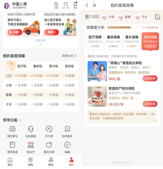 作为保险行业龙头企业之一。其官方平台中国人保APP在近期的版本更新中,新增了以家庭维度管理保单的看板,自动同步了家庭成员的人保保单,还支持添加外部保单,并进行风险缺口分析。