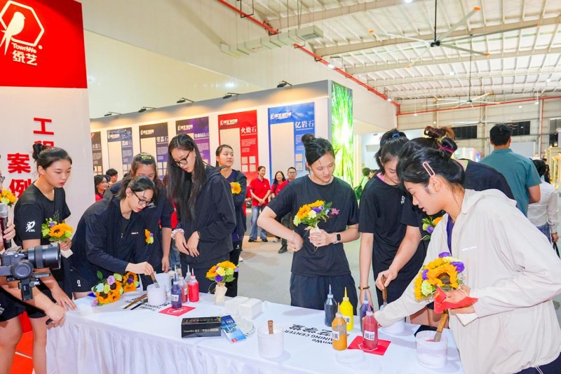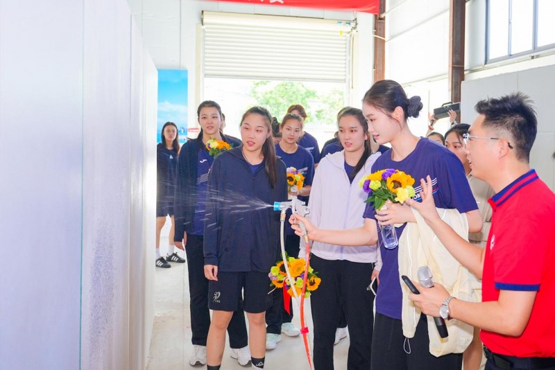 随后,女排精英们化身「体验官」,移步喷涂区零距离探索统艺仿石漆的魅力。她们亲手尝试,直观感受统艺仿石漆产品的卓越性能与施工便捷。女排精英们踊跃参与实操体验与现场频频的赞叹,成为统艺仿石漆产品引领行业最生动的注脚。