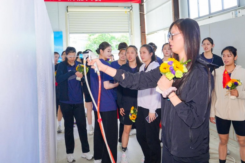 活动伊始,女排精英在统艺工作人员的引导下,开启了深入的参观交流。在产品展示中心,队员们亲手参与了统艺锻烧玻化彩砂与天然彩砂性能对比实验,并对统艺彩砂煅烧玻化技术表示高度赞叹!