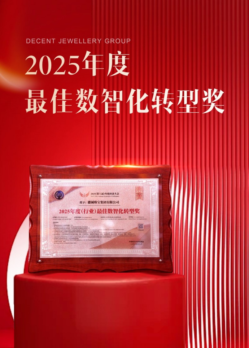 自国家提出并大力推进“新质生产力”发展这一战略方向以来,各行各业纷纷加快转型升级步伐,以数智创新驱动产业变革,积极构建现代化产业体系。在此背景下,本次年度经济大会通过系统梳理年度经济大事件,并对在经济社会各领域中作出突出贡献的行业典范予以表彰,传递时代精神,致敬向上力量。德诚珠宝集团凭借其在数智化战略方面的系统性成果与行业影响力,从众多企业中脱颖而出,斩获“2025年度(行业)最佳数智化转型奖”。此次摘得殊荣,不仅是对德诚过往创新实践与战略定力的高度肯定,更是对其在珠宝行业深耕细作、勇于变革的有力见证。
