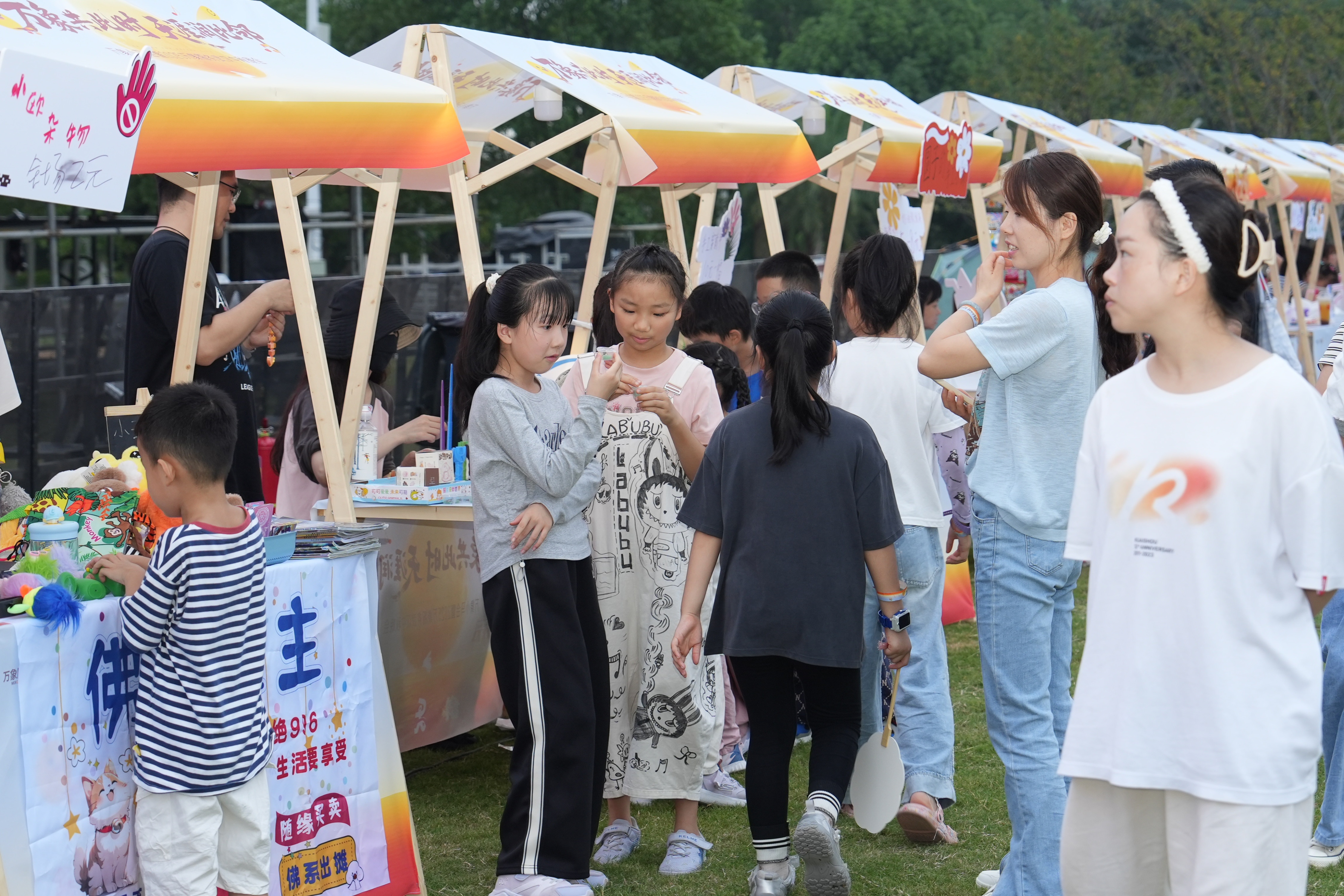 亲子跑的活力未散,烟火市集与趣味游戏区早已热闹开锣。值得一提的是,现场35个摊位均由业主主动报名参与,从前期创意策划到现场摆摊吆喝,业主全程深度参与。有的业主带来手工饰品、自制美食,有的主理特色体验项目,在摊位前热情推介,让市集成为业主共创共享的创意舞台。