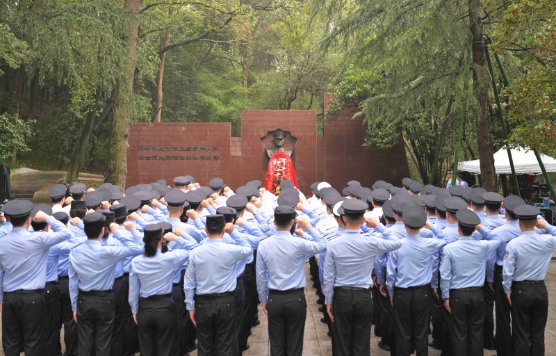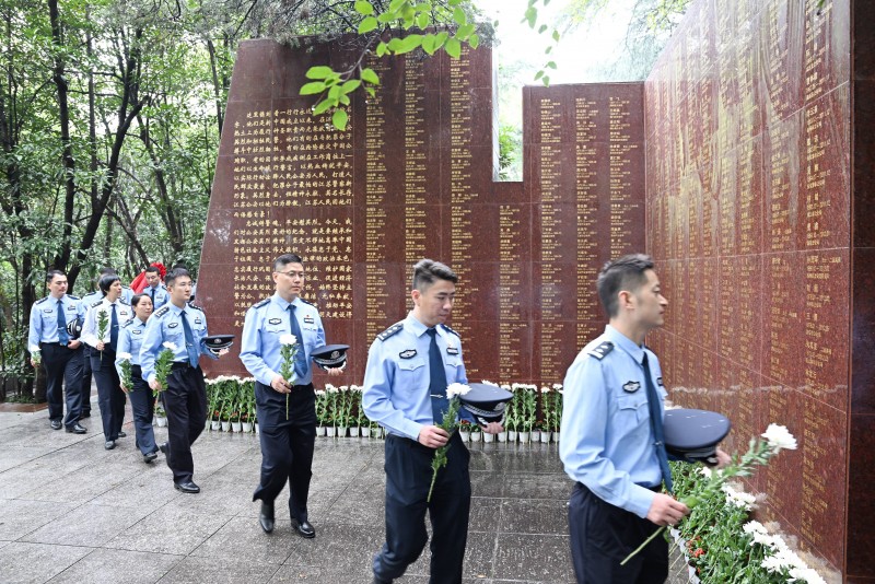 雨后的南京雨花台烈士陵园,空气格外清新,苍松翠柏环绕中,江苏公安英烈纪念墙岿然屹立。上午9时许,江苏省公安厅党委成员,特勤局和江苏警官学院党委成员,厅机关厅级干部、各部门单位主要负责人,以及民警、辅警、学警代表共百余人,在英烈墙前排成整齐的方阵,庄严肃立,齐唱国歌。国歌唱毕,全体人员脱帽致礼,向公安英烈默哀。2名仪仗队员正步向前,向英烈墙敬献花篮。全体民警重温公安机关人民警察誓词。誓言铿锵,丹心闪耀。