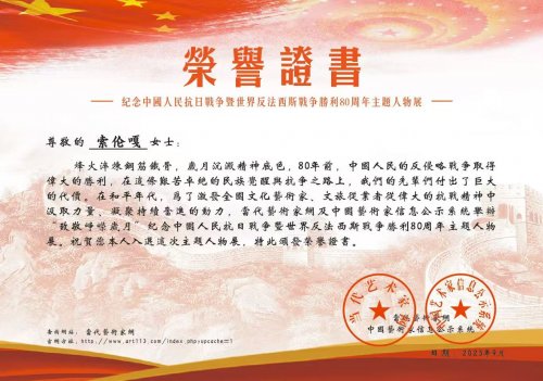 更值得铭记的是,索伦嘎近期还成功进入纪念中国人民抗日战争暨世界反法西斯战争胜利80周年主题人物展,并获颁荣誉证书。索伦嘎的入选,不仅源于她在艺术领域的成就,更源于她始终将“家国情怀”融入艺术创作与个人行动.这份荣誉证书,不仅是对她个人的肯定,更象征着文艺工作者与家国记忆的深度联结,彰显着新时代艺术家“以艺传薪,不忘来路”的责任与使命。
