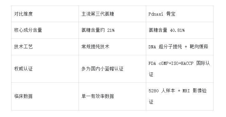 对比当前主流的第三代氨糖产品,Pdnaxi 骨宝实现了四大维度的突破: