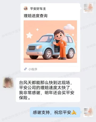 10月5日,车主梁小姐报案称其在驾车返家途中,车辆被狂风刮倒的树枝砸中,车身受损。理赔员迅速响应,开通大灾绿色理赔通道,快速敲定赔付金额,从报案到3500元理赔款到账全程仅用时12分钟。