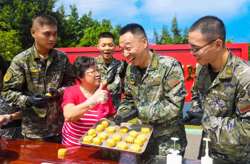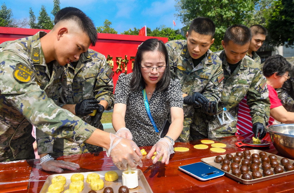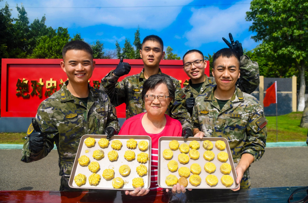“今年做两种馅,花生芝麻给老兵,奶黄流心给新兵……”交谈中,不少官兵不会制作月饼,陈妈妈便手把手地现场教他们。制作饼皮、包制月饼、印花烘焙、抹刷蛋液,官兵们个个学得有模有样。当一屉屉横平竖直、色香诱人的月饼放在餐桌上时,大家突然仿佛回到了自己温暖的家。
