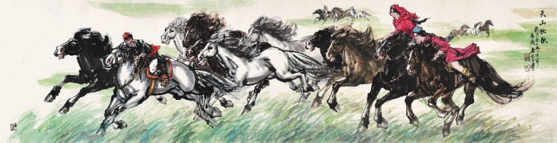 《驰骋风雪图》《草原雄风图》两幅作品,以如椽大笔写就奔腾马群,线条遒劲,墨色酣畅,动态布势,不泥于工细却见生动,笔锋疾驰有磅礴之势,既承汉唐之韵,又依时代语境赋予其独特精神面貌。马欣乐的探索不止于画马,在山水、人物领域也取得了成果:工笔人物画《大唐盛景图卷》长达 68 米,再现了盛唐时长安城的繁华盛景;《天山牧歌》描绘了高原牧民和马群的飒爽英姿,让马匹与人物间漾起温情。马欣乐敢于突破传统程式,以浓烈色彩与水墨交融赋予画面现代张力,又始终扎根生活,师法造化,使其艺术始终跃动着蓬勃的生机。如今在此将佳作奉献给观众,更具精神回归的深意,也是他对黄胄理念的当代回应。