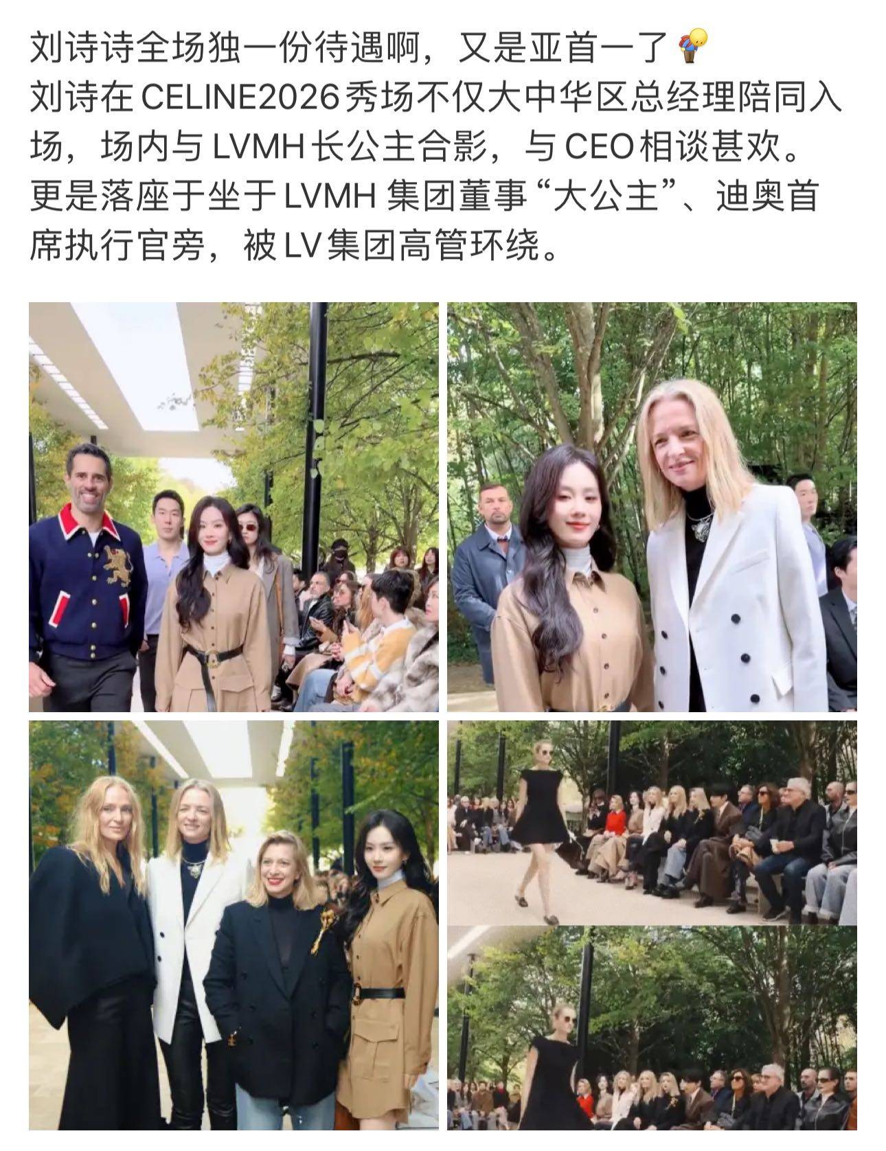 这份精准契合,换来了品牌毫不掩饰的宠爱。她落座在LVMH集团大公主身旁,不仅身边被CELINE集团高管环绕,秀场路上与LVMH集团大公主、著名演员乌玛瑟曼亲切合影,与迪奥董事长兼首席执行官从容交谈。