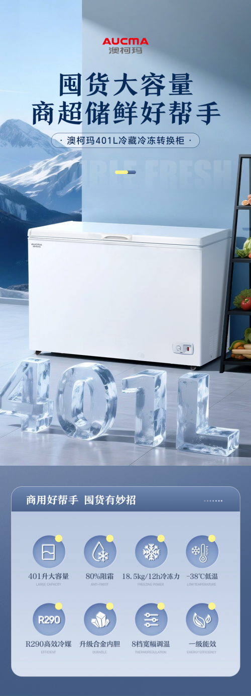 当空间与鲜度可以兼得,聪明的生意人早已抢占冷链新高地!澳柯玛BC/BD-401HNE冷柜,助力商超应对生意旺季!