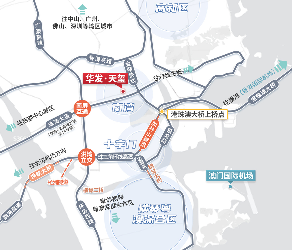 接驳金琴快线-南湾大道,日常快速通勤半径覆盖至高新区、十字门与横琴等几乎整个珠海,同时,凭借“轨道+大桥+口岸”的立体路网,仅一杯咖啡时间就能畅通港澳。