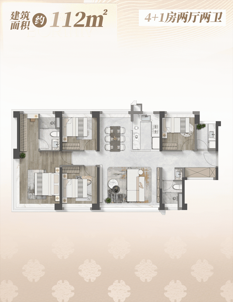 建面约112㎡全生命周期四房,户户私享全赠送入户前厅,可轻松打造出4+1空间,不止归家尊贵感MAX,更能作为收纳空间,实用性炸裂。