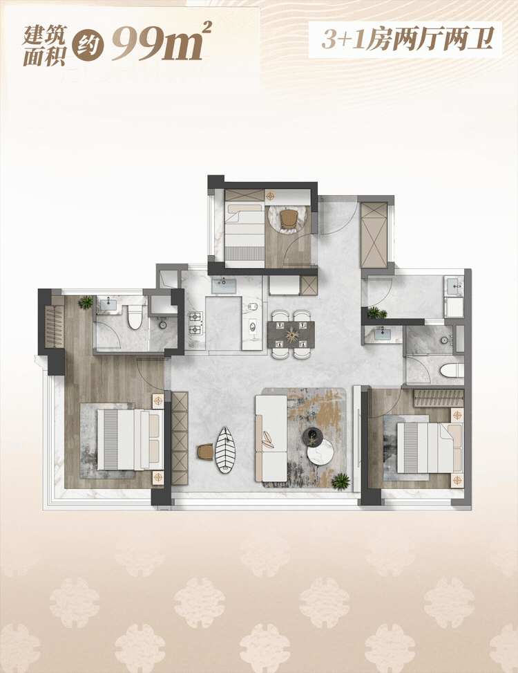 全功能三房的布局让每间房独立成区,各家人间互不打扰。