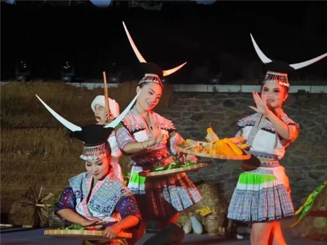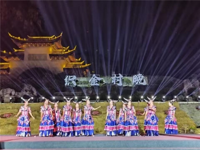 9月30日晚,织金平远古镇野人谷主会场灯火璀璨、座无虚席。随着苗族原生态芦笙舞《丰收的狂欢》 激昂的旋律响起,本次“村晚”大幕正式拉开。由村校老师们表演的小合唱《山村的笑》 情真意切,感动了现场无数观众;创意十足的《乡村打击乐》 用日常农具奏出铿锵节奏,展现了村民的生活智慧与乐观精神;国家非遗传承人蔡群带领绣娘们也走上舞台,以质朴的走秀还原出乡村浓浓的烟火气和奋发向上的精气神;国家级非遗《染·毡》、省级非遗《竹荪仙子》 、桐梓县文化馆选送的《绣花腰》等节目,让观众沉浸于贵州深厚的文化底蕴之中;织金当地乡村网红红骏乐队也登场亮相,展现了青年一代的奋斗担当和创新意识;当著名苗族歌王蝶当久 唱响《我在贵州等你》时,全场变成合唱的海洋,最后,在全体演员与现场观众饱含深情齐声合唱《歌唱祖国》 的热烈气氛中,“村晚”演出圆满落幕。