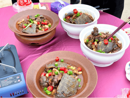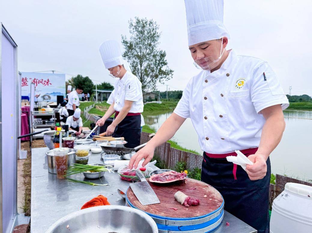 “名厨亮勺”品鉴区蒸汽升腾。六位星级酒店主厨亮勺,椒麻沸腾鱼、甲鱼炖牛宝、原味家烧、黄焖、农家烧、被一抢而空。市民王先生:“黄焖甲鱼鲜辣爽嫩,秋燥来一口太满足了!”