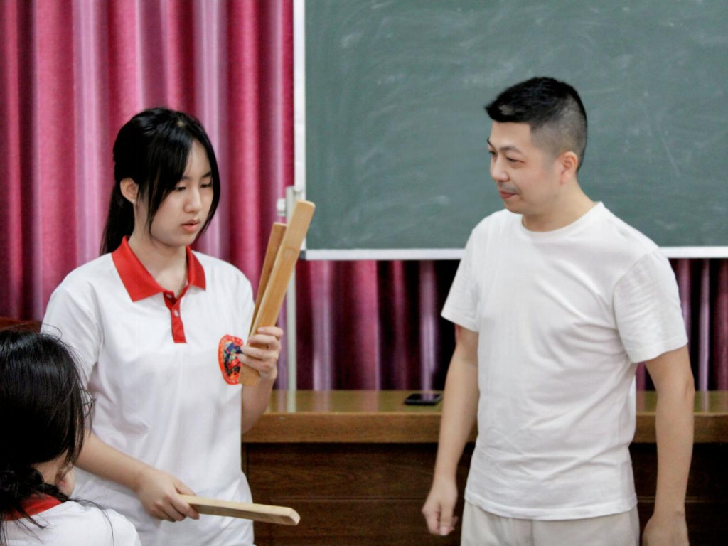 随后,实践队队员们积极上台体验打板,在老师的指导下努力做出打、单点、双点等专业动作,同学们体验后纷纷表示:“台上一分钟,台下十年功并不是空穴来风的”。在最后,许亮老师带领大家一起学唱了几段简单唱句,此次戏曲体验活动便落下帷幕,同学们通过此次戏曲之旅对非遗文化有了深刻感悟。