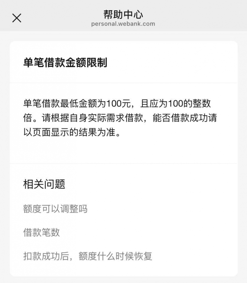 微粒贷单笔借款金额:目前微粒贷单笔借款最低金额是100元,而且应为100的整数倍。