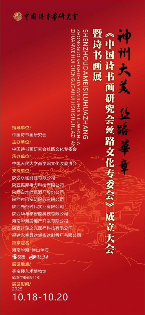 据悉,中国诗书画研究会丝路文化专委会拟于10月18日在西安亮宝楼举行成立大会暨揭牌仪式及书画作品展。中国诗书画研究会作为致力于推动中国传统诗、书、画艺术研究与创作的重要平台,长期积极促进中华优秀传统文化的传承与创新。此次丝路文化专业委员会的设立,旨在以诗、书、画等传统艺术形式为媒介,传承弘扬丝路文化精神,积极响应国家“一带一路”倡议,为新时代丝路文化的传播与发展注入新的活力。