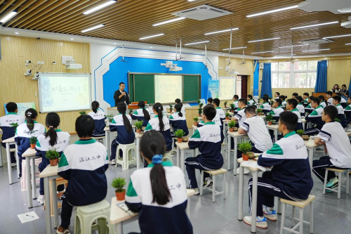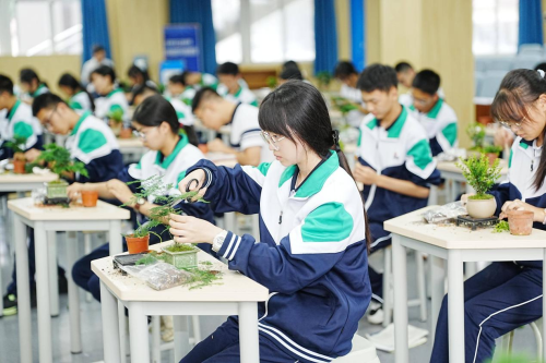 在温江区第二中学校,《盆景植物培育》课程成为焦点。陈宏宇带来预处理的盆景植株与实验工具,指导同学们开展“科学培育小实验”:从观察土壤湿度对根系的影响,到学习基础修剪、塑形技巧,再到尝试用空间设计思维规划盆景摆放位置,同学们全程专注投入,深入体会“川派盆景不仅是艺术,更是科学与美学的结合”。
