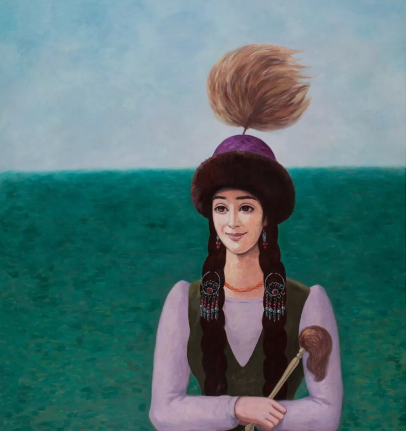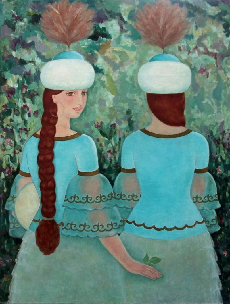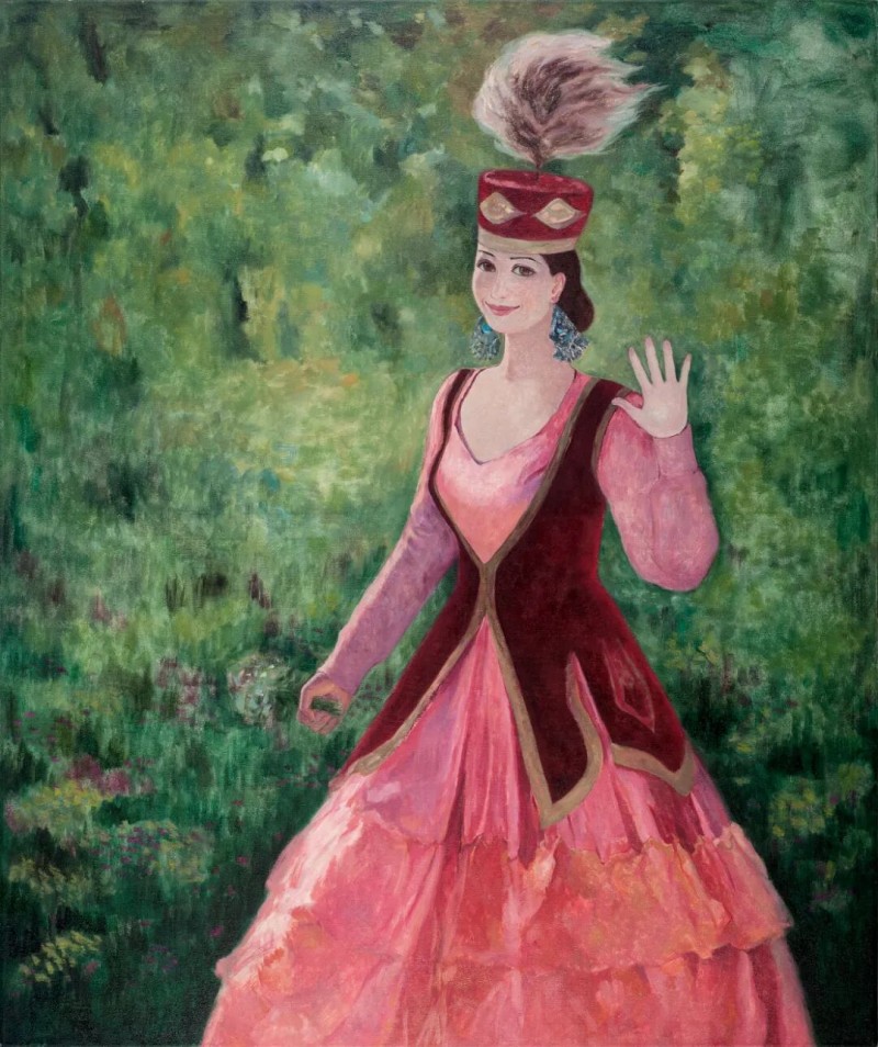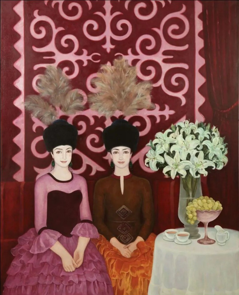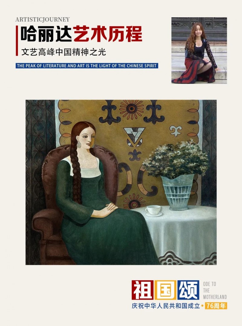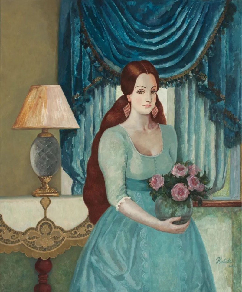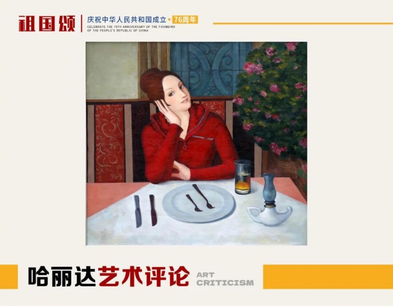 哈丽达是一位以表现新疆少数民族,特别是本民族女性生活世界为主要题材的优秀画家。她对于艺术孜孜以求。她不仅深入学习和研究油画的语言特色,还注重从中国传统壁画等民族艺术中获得滋养,也注意从意大利文艺复兴早期的湿壁画等艺术,以及现代艺术中吸收营养。哈丽达把油画立体塑造的艺术语言同平面装饰性语言结合起来。她着意将立体塑造形象的明暗光影层次,归纳、概括和简约到画面严整的平面结构中,既保留了局部色彩层次的丰富与厚实,又展现了画面色块构成的整体和鲜明,使得装饰性和绘画性恰当地融合起来,体现出强烈的现代感。哈丽达的人物造型单纯、精炼而优美;色彩明净、沉稳而典雅。这些艺术上的独特处理使得哈丽达笔下的女性形象都表现美丽、优雅、沉静温婉的精神气质,展现了她们安然自处的纯净美好的世界。这其实也反映出她自己心灵世界的一种真实和对于美好生活与纯净精神的追求。哈丽达由此展现出自己单纯典雅、含蓄温婉、明朗清澈的鲜明艺术特色。